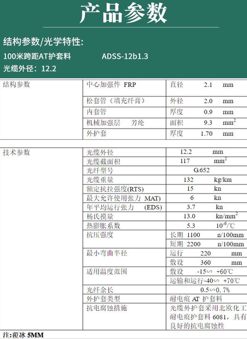 ADSS架空光纜工作在大跨距兩點支撐的(通常為數(shù)百米,甚至超過1公里)架空狀態(tài),與傳統(tǒng)概念的“架空”完全不同(郵電標準的架空吊線掛鉤程式,平均0.4米對光纜有1個支點)。所以,ADSS光纜的主要參數(shù)與電力架空線的規(guī)程接軌。